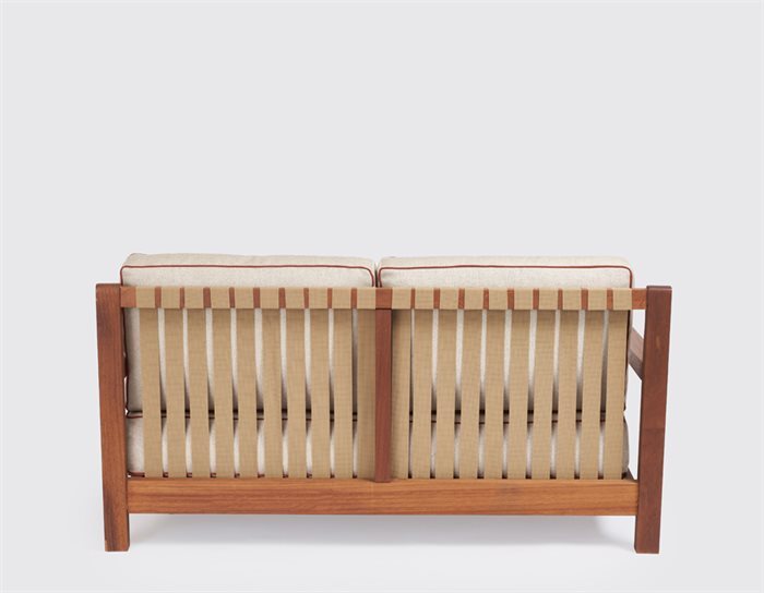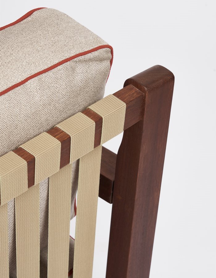 Sofas and armchairs with frames in Iroko wood. Cushions with OUTDOOR padding and removable covers. Side table in Iroko wood.